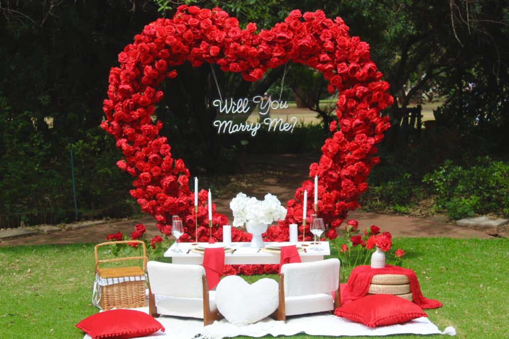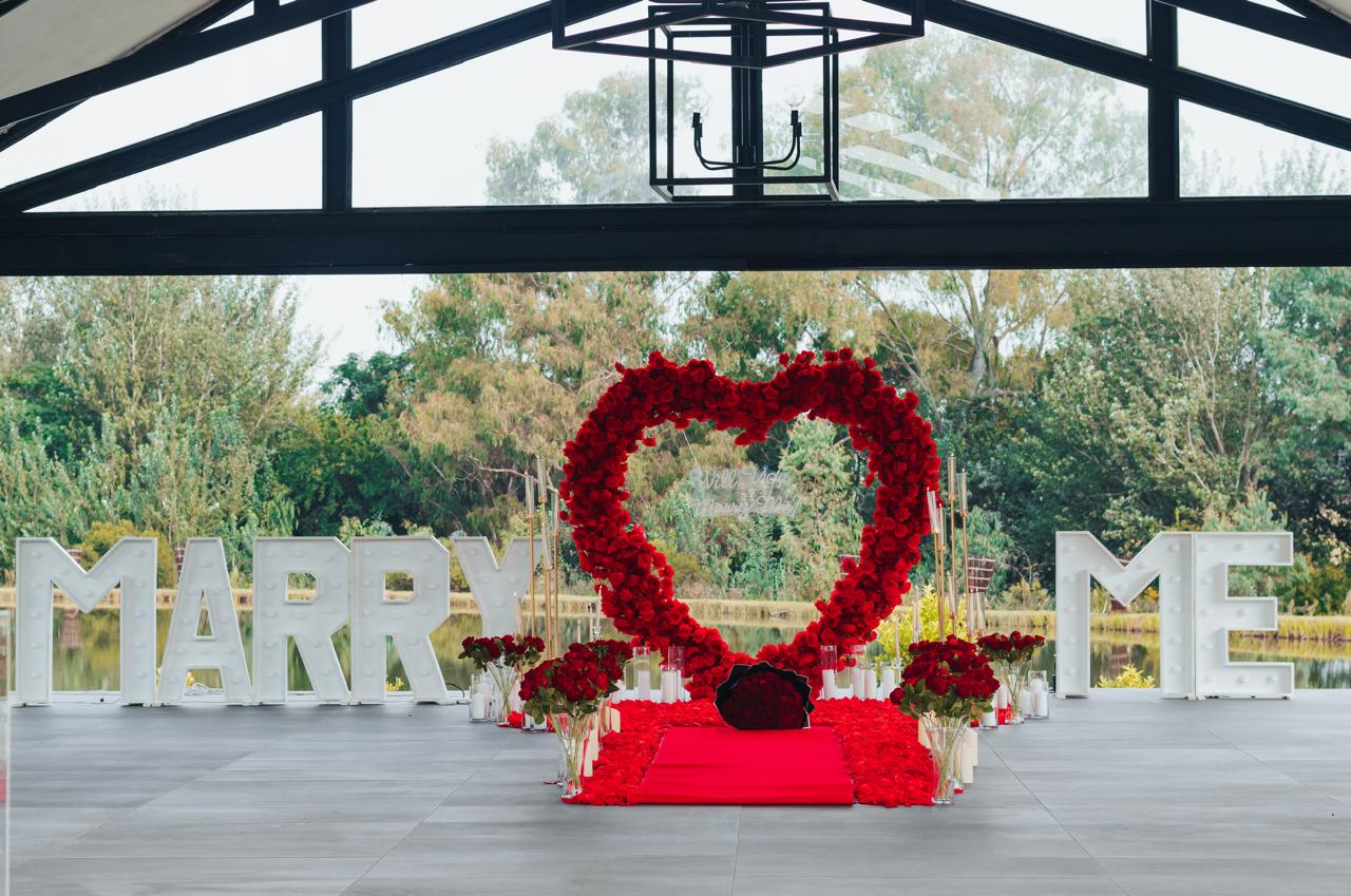 Includes Red heart shape backdrop with red roses, Marry Me - Letters, Artificial roses in vases, Artificial rose petals, Candles, Spark machine x2, Speakers, Champagne stand, Bottle of Champagne. R10200